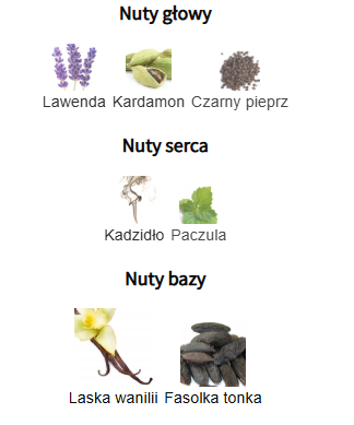 - Nuty głowy: Lawenda, kardamon i czarny pieprz – orzeźwiająca, pikantna mieszanka, która przyciąga uwagę od pierwszego momentu.